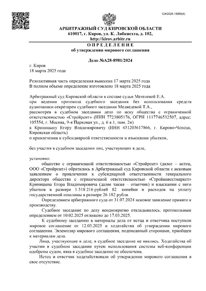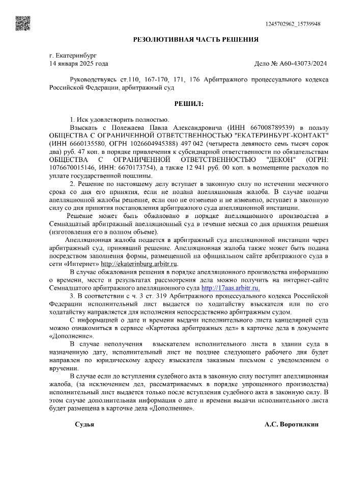 Перечисленные качества позволяют мне максимально обеспечить интересы Клиента и реализовать разработанную схему защиты. Имея за плечами более 100 успешных дел по привлечению к субсидиарной ответственности.